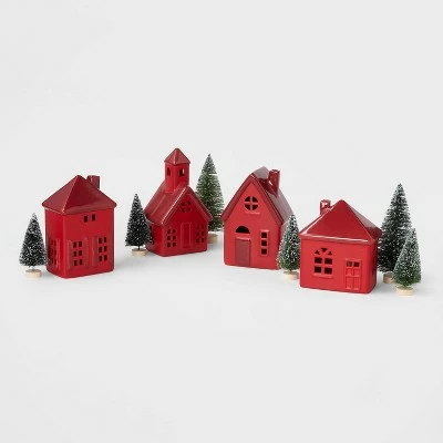 - Includes 4 ceramic buildings in red