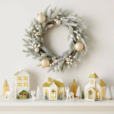 Bring the magic and nostalgia of an old-fashioned holiday to your mantel, entryway or other indoor decorative tableaux with this White and Gold 12pc Battery Operated Decorative Village Kit from Wondershopโข. The set includes three white and gold polyresin houses, three polyresin deer in white, as well as six bottle brush white and gold trees with glitter. The houses illuminates thanks to the two required LR44 alkaline batteries that are included.
