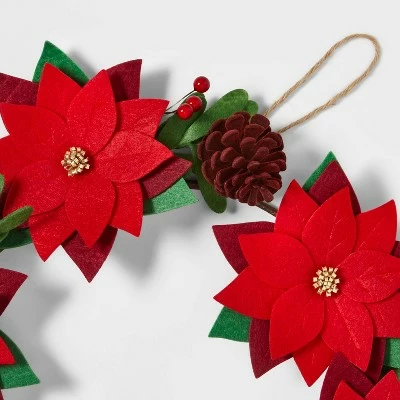 - Features felt poinsettia flowers and pinecones