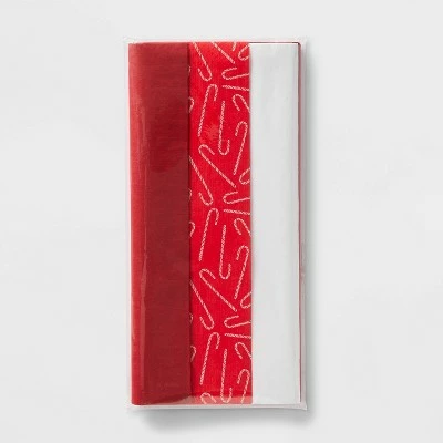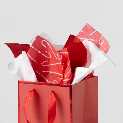 Stuff your gift bags this holiday season with this 150-Count Banded Gift Tissue Paper from Wondershopโข. This pack of banded tissue paper includes 150 sheets in solid red and white colors as well as a white candy cane pattern on a red backdrop for plenty of fun and festive choices. Perfect for holiday gifting or any other occasion, you can place them as fillers inside gift boxes, packages, baskets or gift bags to give a special finish.