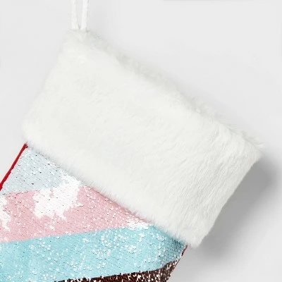 The Pride Reversible Sequin Christmas Stocking from Wondershopβ’ is a stunning addition to your festive decor. This holiday stocking is embellished with reversible sequins that switch from a full red to a diagonal rainbow design to lend Pride-inspired vibes to your Christmas festivities. A white faux-fur cuffed top completes the festive design with a wintry look. The cute and colorful stocking is sure to brighten up your home βhang it on the fireplace mantel, your bedpost or any door handle.