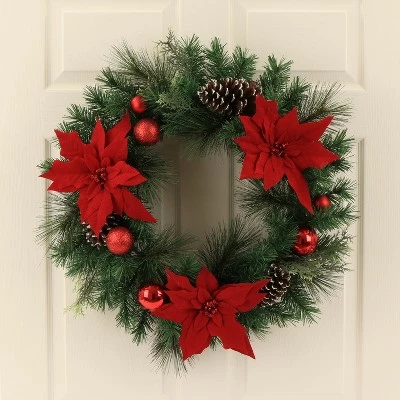 The Christmas Red Poinsettia With Ornaments Artificial Pine Wreath from Wondershopβ’ makes for a festive addition to any door, window or wall. The artificial mixed-tip wreath is accented with red fabric poinsettias, glittery pine cones and shiny red ball ornaments for a stunning display. Suitable for both indoor and sheltered outdoor use, it’s perfect for hanging from your front door, along a wall or above your mantelpiece.
