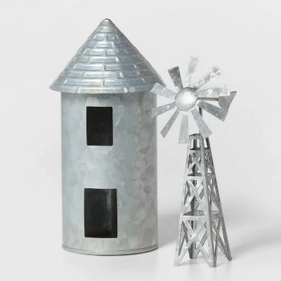 Add some country-inspired charm to your mantel or tabletop with the Galvanized Grain Silo and Windmill Set from Wondershopβ’. This metal figure set comes with two farm-themed decorative pieces β a windmill and a silo β that’ll add a nice rustic touch to your seasonal decor. The galvanized silver metal finish gives the pieces a simple, sleek look that’s great for display anytime of year. Arrange with fake grass in the spring, switch to artificial leaves in autumn and then set atop a bed of imitation snow and red tinsel for a wintry look.