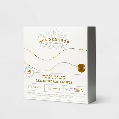 Add a little twinkle to everything from miniature Christmas trees to indoor wreaths, mantel displays and more with the 30-Count LED Dewdrop String Lights Warm White with Silver Wire from Wondershopβ’. Set on a shiny silver wire, this string of fairy lights features 30 tiny lights that can be set to steady, flashing or fading effect. The warm white lights give off a soft glow, while the programmable design, battery-operated power source and 9.7-foot lighted length let you display the lights just about anywhere you please. 100% Satisfaction Guaranteed.