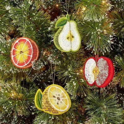 If you’re looking to spruce up your Christmas tree decorations with something out of the ordinary this year, the 4-Count Sequined Felt Fruit Christmas Tree Ornament Set from Wondershopβ’ makes a perfect choice. Made from soft felt fabric, this ornament set includes an orange, a lemon, an apple and a pear, all decorated with sequins for a touch of festive shine. Best of all, each ornament has an attached top loop that makes it easy to hang from the branches of your tree.