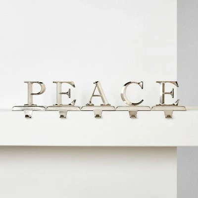 Keep your holiday decor classic with the PEACE Christmas Stocking Holders from Wondershop™. This pack of stocking holders comes with five that when laid beside each other spell out the word “Peace,” adding a delightful touch of merriment to your seasonal display, and their finish allows for easy coordination with the rest of your decor. Their weighted construction helps them to lay sturdily flat on a ledge or mantel, as well as contributing to holding up to two pounds of a filled stocking, and tapered hooks allow for easy hanging of a stocking from its loop.