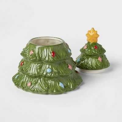 The Ceramic Tree Cookie Jar from Wondershopβ’ is perfect for holiday display, or keep it out year-round to add a whimsical touch to your kitchen. This green earthenware cookie jar depicts a decorated Christmas tree with colorful ornaments and a golden star on top. The top lifts off for easy access, and the 68-ounce capacity lets you store plenty of cookies conveniently on a countertop or tabletop.