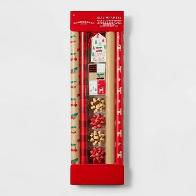 Add festive charm to your holiday gifts by wrapping them with the 80-Square-Foot Gift Wrap Pack from Wondershopβ’. This gift wrap pack includes gift wraps, tags, adhesive tags and bows, all in both gold and silver tones for a stunning look. The wraps come in both solid and printed patterns that range from plaid to an illustration of a car with a holiday tree and more to give you a variety of options for packing. Made with paper, this kraft brown and red gift wrap pack is perfect for the holiday season.