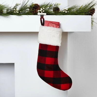 Hang up the Buffalo Plaid Christmas Stocking with Faux Fur Cuff from Wondershopโข for a classically charming look. This Christmas stocking is made from a plaid fabric with a faux-fur cuff for a cozy-chic look that’ll blend in beautifully with the rest of your seasonal decor. It comes in black and red for a joyful look, along with an attached loop that makes it a breeze to hang from your mantel, staircase or wall. Whether you fill it with candy, socks, gift cards, lip balm or any other small trinkets, this plaid Christmas stocking rounds out your holiday decor in merry style.