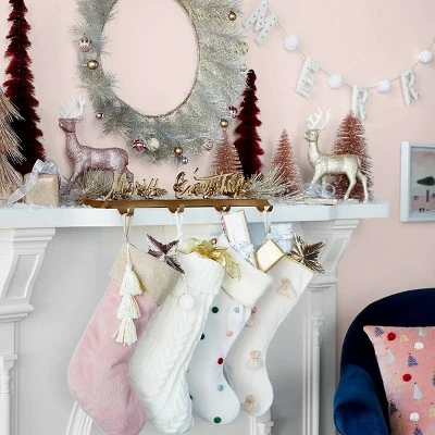Expand your stocking collection with the Cable-Knit Christmas Stocking from Wondershopโข. Designed with a cable-knit pattern in an ivory hue, this stocking is perfectly sized for holding small presents, holiday candy and much more. Decorated with twin pom pom accents, it also features a top loop for easy hanging from a hook, nail or festive stocking holder.