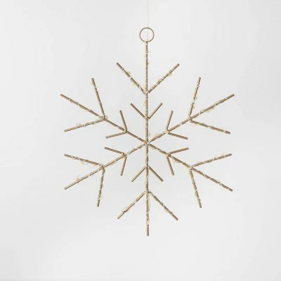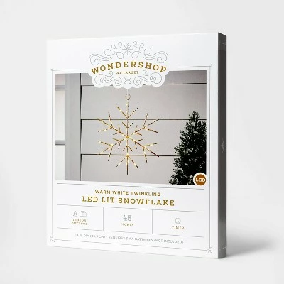 Bring a little extra light and cheer to your front door, window, living room and more with the Christmas LED 14 inch Gold Snowflake Novelty Sculpture from Wondershopโข. This snowflake-shaped light-up holiday decor features 45 warm white lights for a welcoming and festive glow you’ll love, in a combination of 9 twinkling and 36 steady illuminating long-lasting LED bulbs. A timer feature lets you set this light-up snowflake decor to stay on for 6 hours and off for 18 if you prefer, and a top loop makes for easy hanging in the location of your choice.