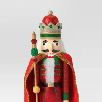 Bring festive touch to your year-end celebrations with this Large Glitter Cape Nutcracker from Wondershop™. This tall king nutcracker figurine wears a red uniform designed with a red cape featuring a golden trim as well as a rounded crown, and it holds a staff in its hand. It’s supported on a weighted rectangular red base with “2022” embossed on the front, making it easy to place on any flat surface. Place it on your coffee table, console table, mantel or desk to add Christmas cheer to your home.
