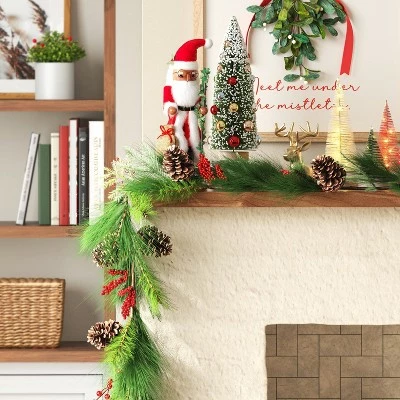 - Features Santa holding holly leaves and a burlap sack